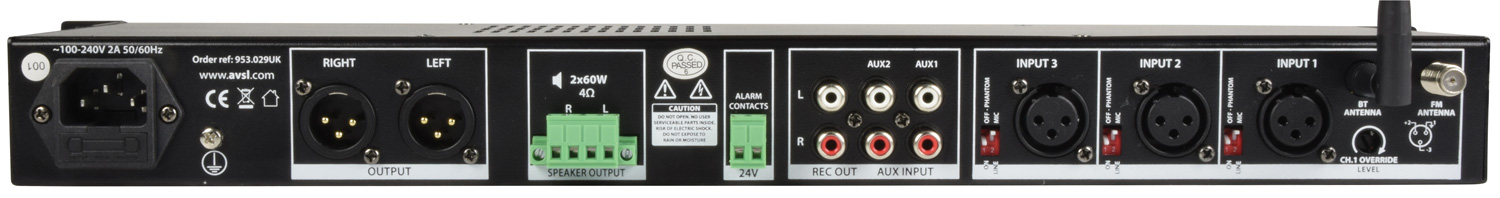 Line Output signals are fed to L+R XLR outputs providing connectivity onto further amplifiers for larger installations.