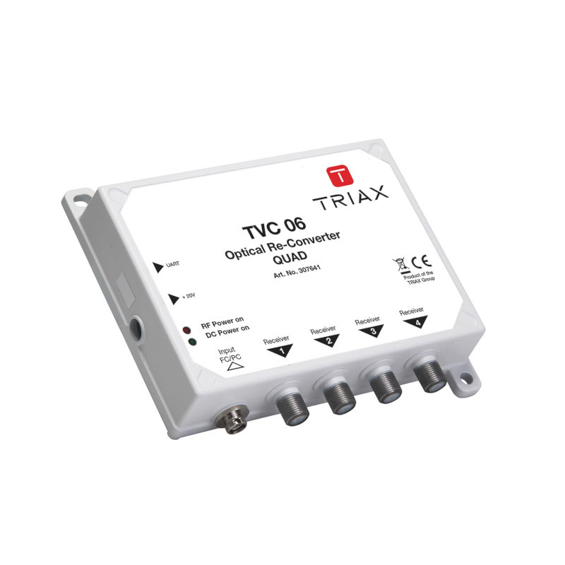The TVC 06 is a mini optical-to-coax converter, which convert the frequency stacked optical signal provided from an Opto-LNB TOL or a TOU232-Kit (IRS 1) sidecar unit into four switched universal coax signals like a Quad LNB. The converters also provide a coax DTT/DAB/FM signal diplexed onto each output when it is inserted into the optical transmitter TOU 232 SA.