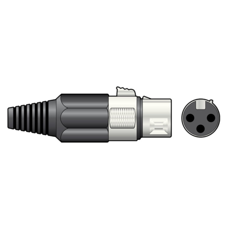 3-pin XLR connectors with strain relief and plastic cable protector.